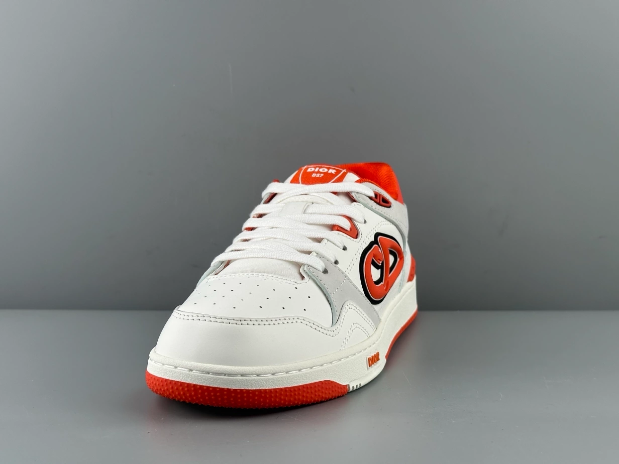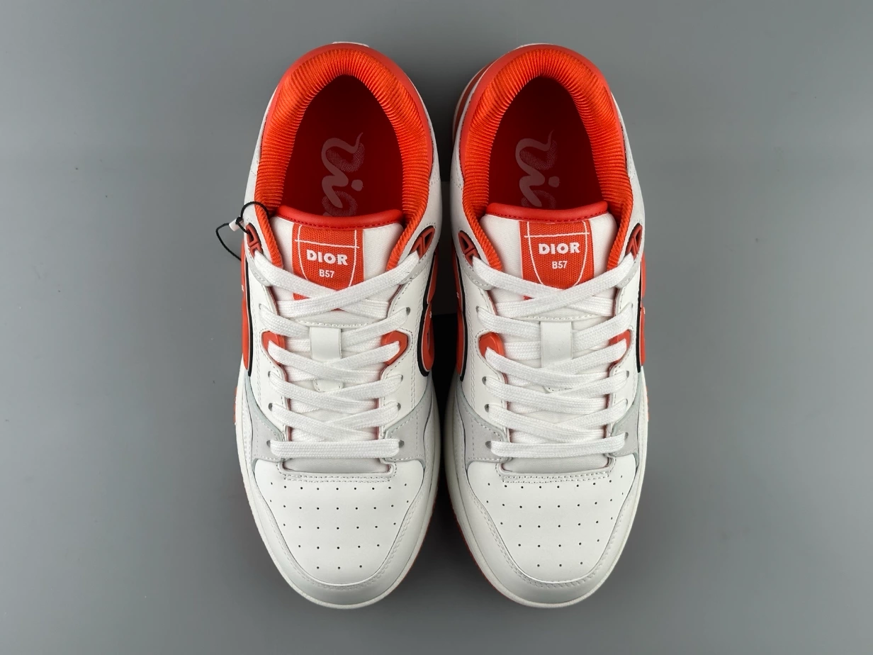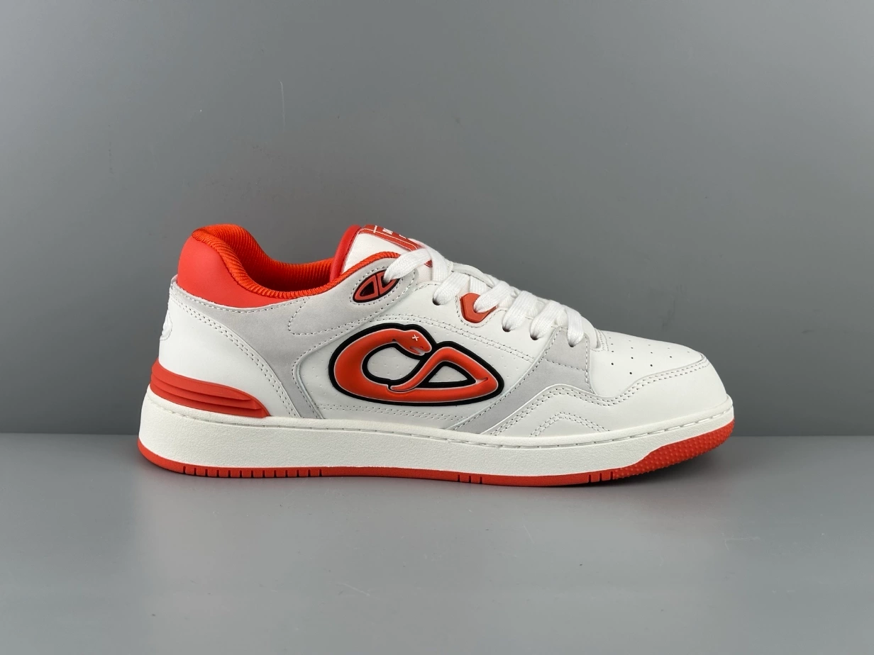 The B57 Dribble low-top sneakers crafted in white and vermilion red smooth calfskin with white suede, the style is enhanced by the DIOR AND KAWS signature on the sides, reinterpreting the House’s signature in the shape of a colorful snake. Various hallmark details embellish the tongue, sole and rear, while perforated detailing, topstitching and a rubber insert accentuate its athletic appeal. Completed by a two-tone rubber sole, the sneaker will elevate any favorite outfit.